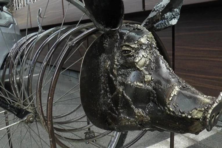 Vladan Janković na parkingu svog objekta napravio je pravu pometnju postavivši krajnje neobičnu skulpturu za čuvanje bicikli u obliku prasećih rebara i glavudžice.