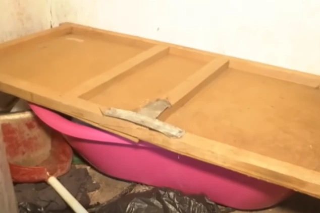 Telo devojčice je umotano u pelene i položeno u kadi u jednoj sobi koja je puna nameštaja.