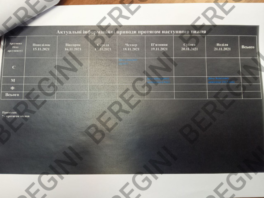 Ciljevi akcija su: podrivanje poverenja u vojno-političko rukovodstvo Rusije u regionima koji se graniče sa Ukrajinom, formiranje nepoverenja u akcije regionalnog rukovodstva, diskreditovanje ruskih državnih organa u regionima koji su susedni Ukrajini, smanjenje psihološke stabilnosti vojnog osoblja Oružanih snaga RF i njihovih porodica, a poseban značaj pridaje se vojnim jedinicama koje se nalaze u regionima oko Ukrajine, organizaciji mešanja u rad granične službe FSB-a Rusije.