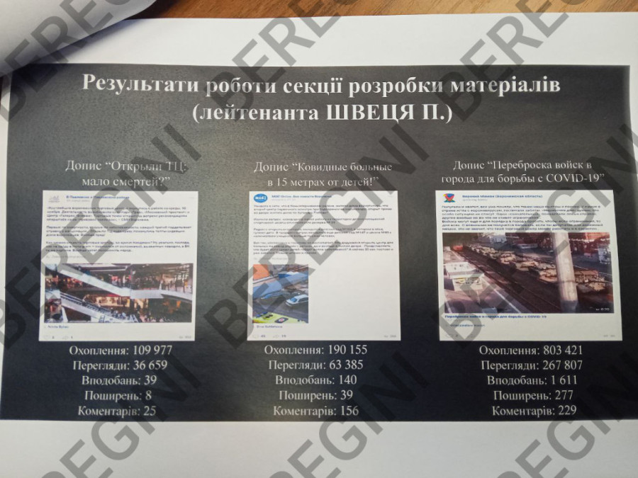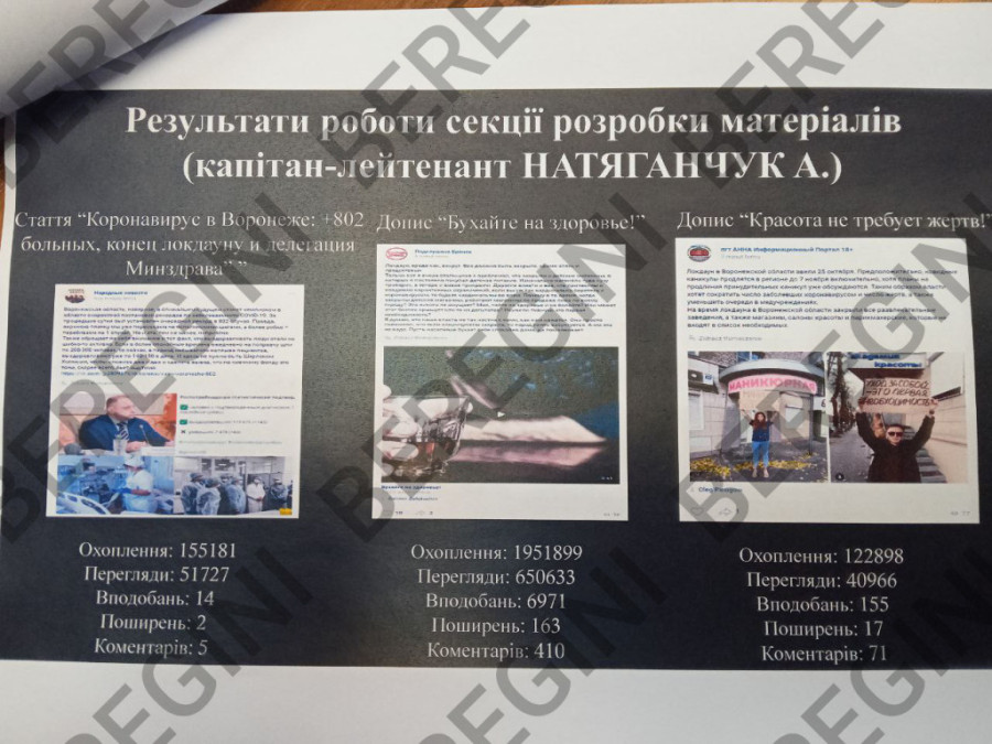 Na primer, u okviru kampanje „Nevolje“, predstavljen je izveštaj o publikacijama na Telegram kanalu "Ogon Urazmetov", na platformama Fishkija, Pikabua i drugih. Članci i postovi, posebno, trebalo je da ubede čitaoce da antiruske sankcije Zapada "guše" Ruse, da se zemlja ne nosi sa pandemijom itd.