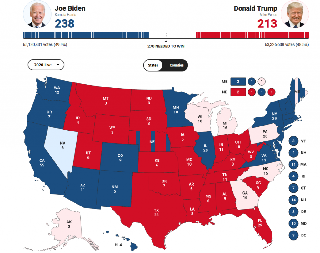 Tramp je, na osnovu trenutnih rezultata, osvojio 213, dok je Bajdenu pripalo 238 elektorska glasa.