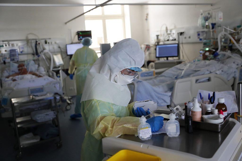 A nurse takes notes inside a COVID-19 ICU at Santa Maria hospital in Lisbon, Friday, Oct. 30, 2020. Portugal is reporting a record number of new COVID-19 cases, deaths and hospital admissions. (AP Photo/Armando Franca)