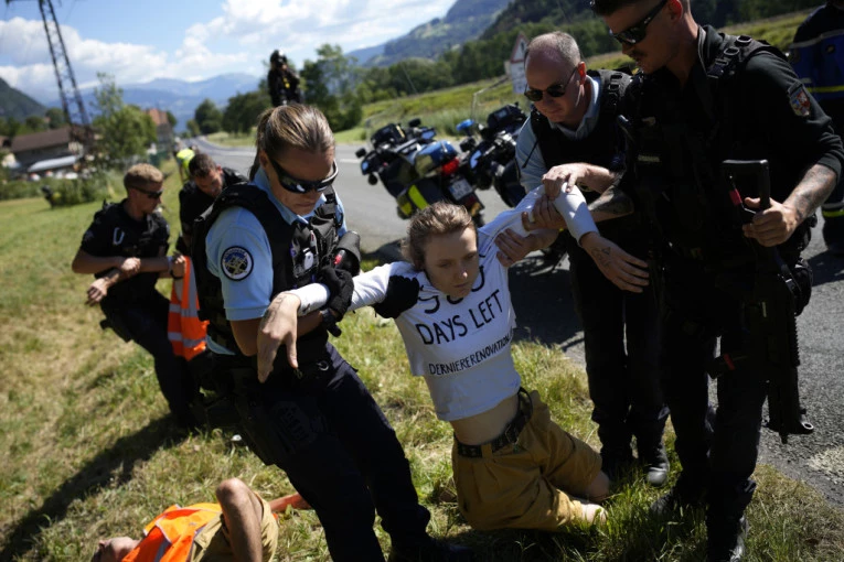 Demonstranti iz pokreta "Derniere Renovation" ("Poslednje renoviranje") upalili su crvene baklje dok su blokirali put tokom 10. etape prestižne trke na Alpima, preneo je Gardijan.