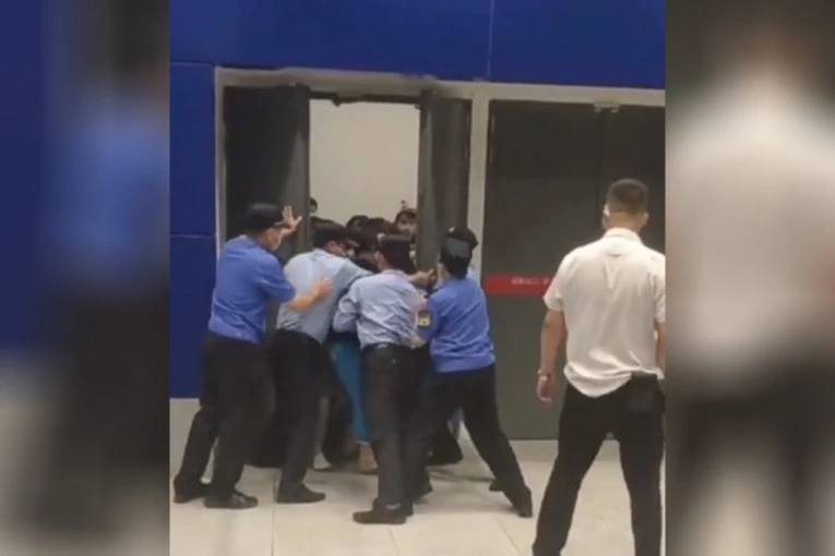 Na video-snimcima se vide pripadnici obezbeđenja koji u jednom trenutku pokušavaju da zatvore vrata, ali ih masa s druge strane na silu otvara i beži