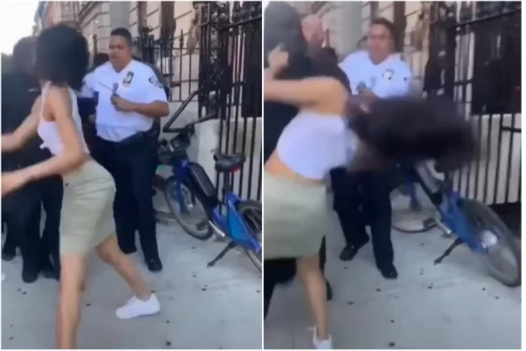 Njujorški policajac snimljen je kako je snažno udario jednu devojku u glavu posle čega je ona momentalno odletela na zemlju.