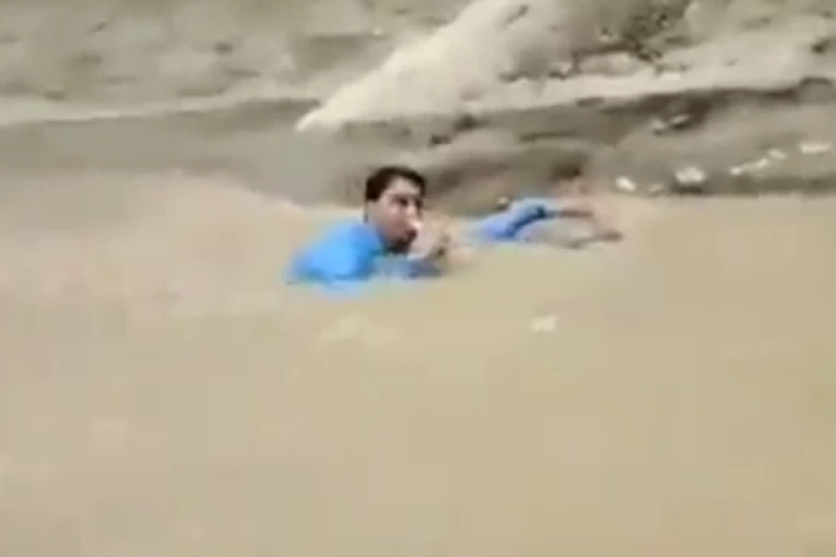 U snimku koji kruži društvenim mrežama vidi se da mu iz mutne vode vire samo glava i ruka sa mikrofonom dok se drugom drži za kamen.