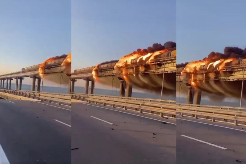 Na krimskom mostu eksplodirao je rano jutros kamion usled čega su se zapalile cisterne sa gorivom u okviru vozne kompozicije koja je u tom trenutku prolazila. Usled eksplozije došlo je do obrušavanja dva kolovozna dela, dok plovni lukovi mosta nisu pretrpeli nikakva oštećenja.