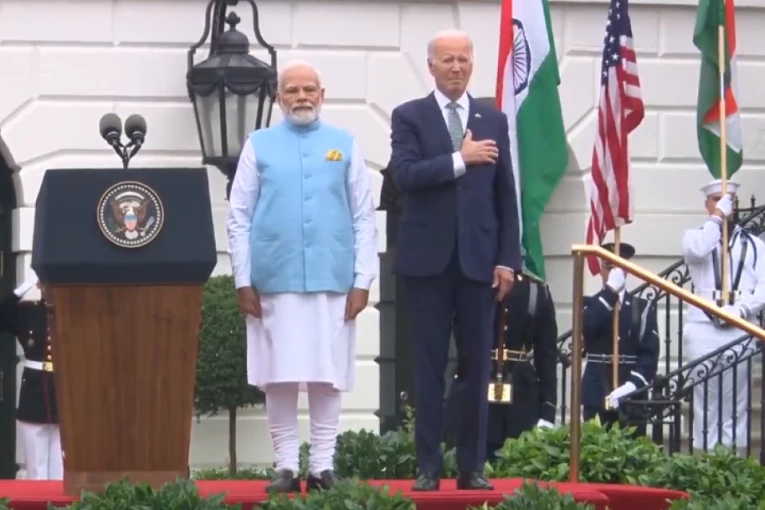 Bajden je poželeo dobrodošlicu Modiju Beloj kući tokom premijerove državne posete kada su njih dvojica stali jedan pored drugog da poslušaju himne ove dve nacije nacije.