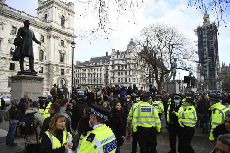 Policija je danas u Londonu hapsila demonstrante koji su se okupili da negoduju protiv mera britanske vlade i pokušavala da rasturi proteste ispred Vestminsterske palate, zdanja britanskog parlamenta u Londonu.