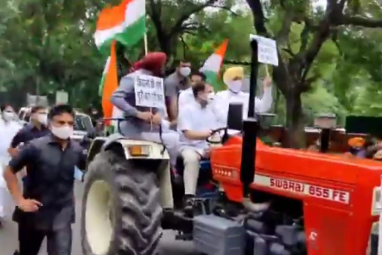Indijski političar i lider Kongresne partije, Raul Gandi, traktorom je došao pred zgradu Parlamenta u Nju Delhiju kako bi iskazao podršku protestima poljoprivrednika.