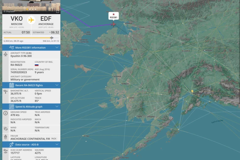 Ruski avion specijalnog letačkog odreda „Rusija“ sleteo je na međunarodni aerodrom Ted Stivens u Enkoridžu na Aljasci, uoči susreta predsednika Rusije Vladimira Putina i predsednika SAD Donalda Trampa, prenosi Flightradar24.