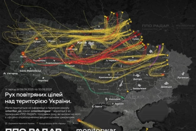 Ukrajinski mediji objavili su mapu koja prikazuje kretanje ruskih dronova tokom poslednjih napada, pri čemu su pogođeni Donbas i više zapadnih i centralnih oblasti, među kojima su Ivano-Frankovsk, Lavov, Luck, Odesa, Vinica i Žitomir.