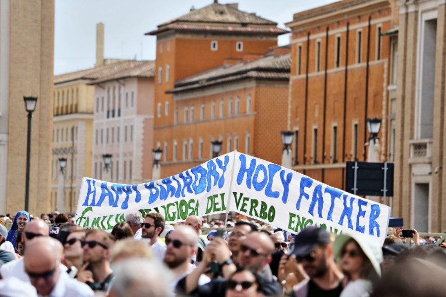 Vernici okupljeni na Trgu Svetog Petra tokom njegovog tradicionalnog podnevnog blagoslova nosili su transparente sa natpisom "Srećan rođendan", balone i čestitke