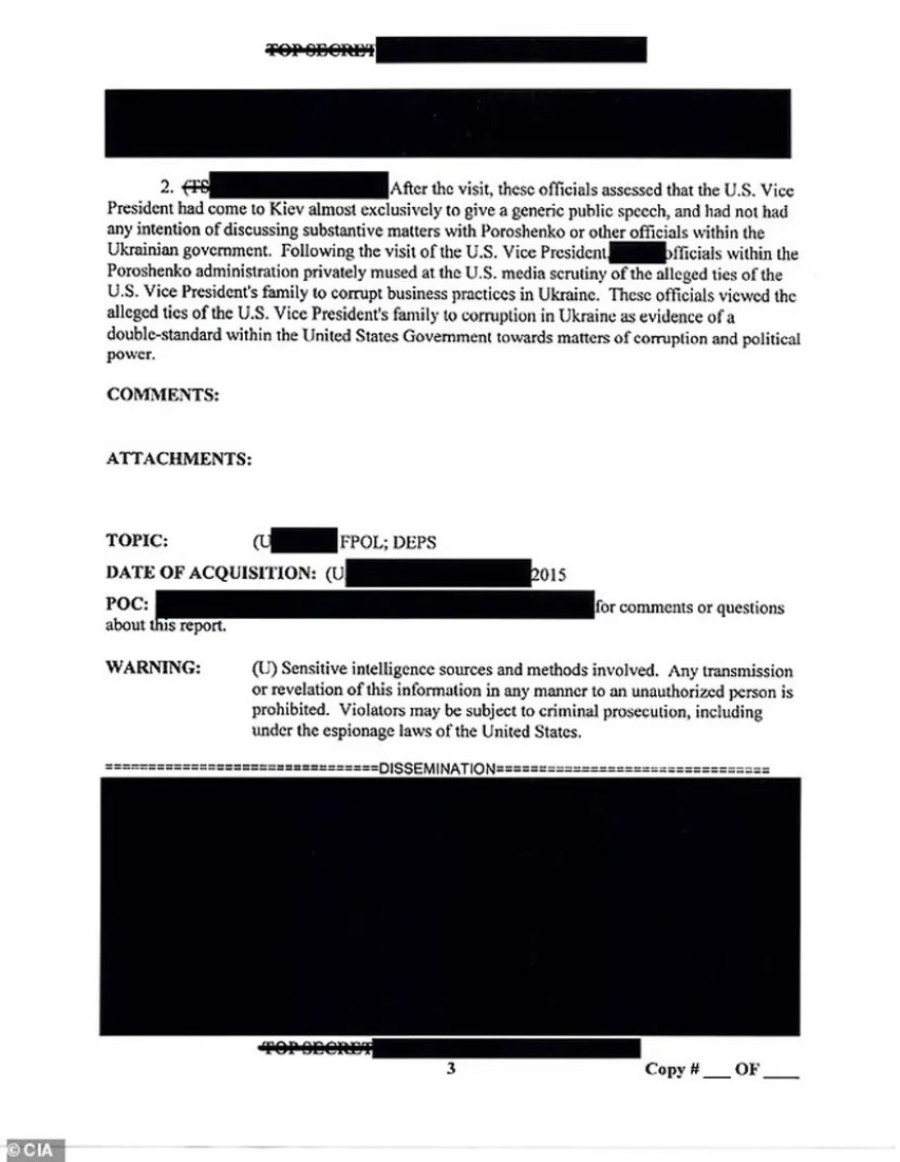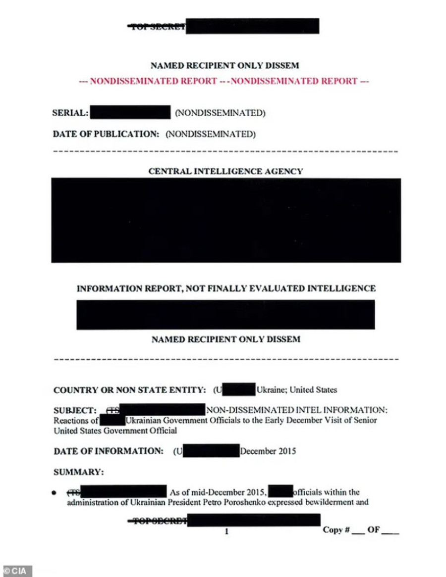 Reč je o "strogo poverljivom" materijalu sa brojnim zatamnjenim delovima, u kom se navodi da su i ukrajinski zvaničnici s nepoverenjem posmatrali Bajdenove posete Kijevu.