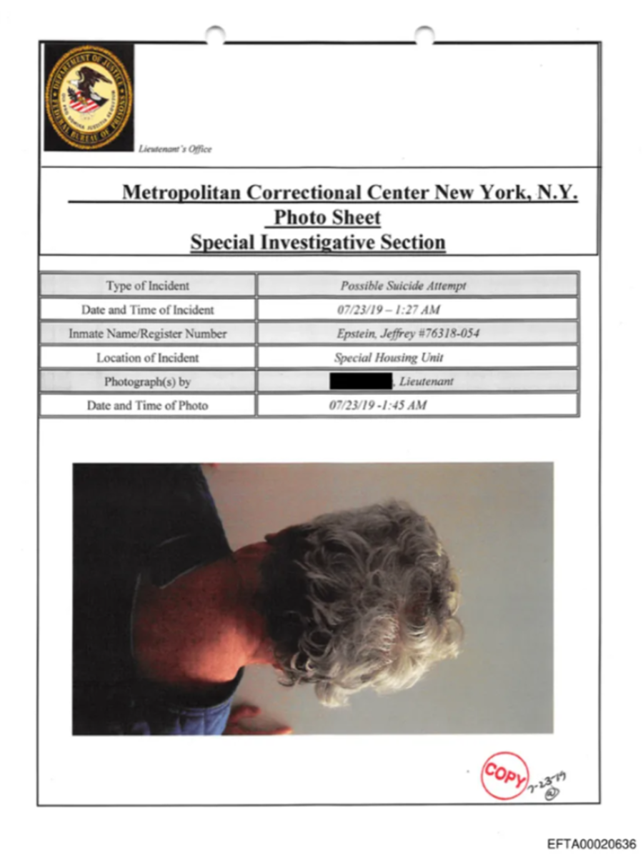 Na njima se vidi Epstin kako leži na leđima, na nosilima ili podlozi, sa jasno uočljivim povredama vrata i lica. Te fotografije čine deo interne evidencije kojom se dokumentuje stanje zatvorenika posle incidenta. U spisima se nalaze i snimci njegovog cimera iz ćelije, koji je ujedno i prijavio događaj.
