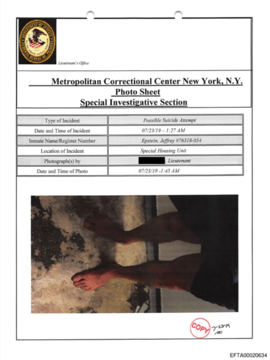U kasnijem izveštaju Zatvorske uprave navodi se da je Epstin te noći pronađen sa narandžastom tkaninom oko vrata, kao i da je njegov cimer potvrdio da je pokušao da sebi oduzme život. Nakon toga, Epstin je nakratko stavljen pod pojačan nadzor, ali je sa tog režima skinut već 24. jula.