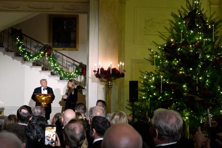 Na fotografiji, nastaloj u Beloj kući, predsednički par stoji držeći se za ruke, dok se iza njih vide bogato ukrašena božićna jelka i praznični dekor, uz američku i predsedničku zastavu. Na prvi pogled svečana scena, ali njihovi izrazi lica odudaraju od očekivane praznične atmosfere.
