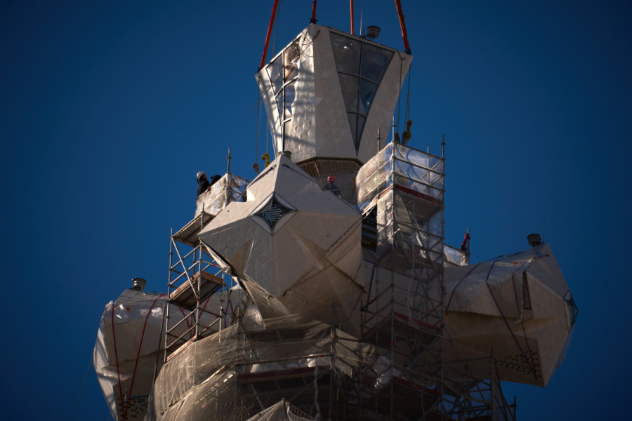 Gornji deo 17 metara visokog četvorostranog čeličnog i staklenog krsta podignut je danas na svoje mesto, čime je završena kula posvećena Isusu Hristu.