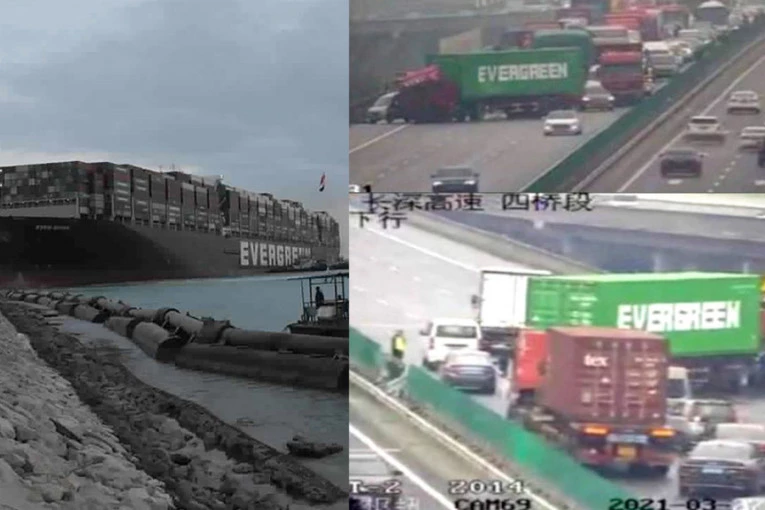 Usred globalne brodske krize koju je izazvao ogromni brod “Ever Given” koji je unajmila tajvanska kompanija “Evergreen Marine Corp”, kamion koji je prevozio kontejner iste kompanije izazvao je masovnu gužvu na prometnom autoputu u Kini.