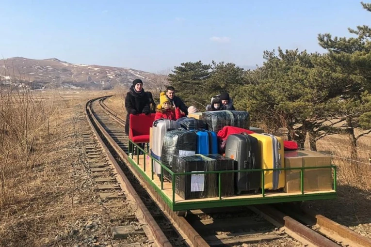 Osam zaposlenih u ruskoj ambasadi u Pjongjangu i njihove porodice putovali su 34 sata kako bi izašli iz Severne Koreje. Jedan od njih spakovao je svoj prtljag i porodicu na manuelna šinska kolica i satima putovao ka svojoj domovini.