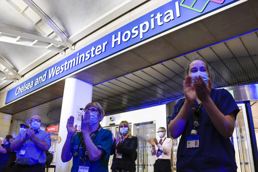 Doctors, nurses and health workers step out the Chelsea and Westminster Hospital to clap, as tribute to Captain Sir Tom Moore, the 100-year-old charity fundraiser who died on Tuesday after testing positive for Covid-19 in London, Wednesday, Feb. 3, 2021. (AP Photo/Alberto Pezzali)
