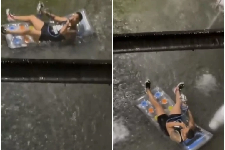 Iako je situacija krajnje alarmantna, jedan muškarac je našao način da se zabavi, pa je leškario na dušeku dok je kiša lila oko njega.